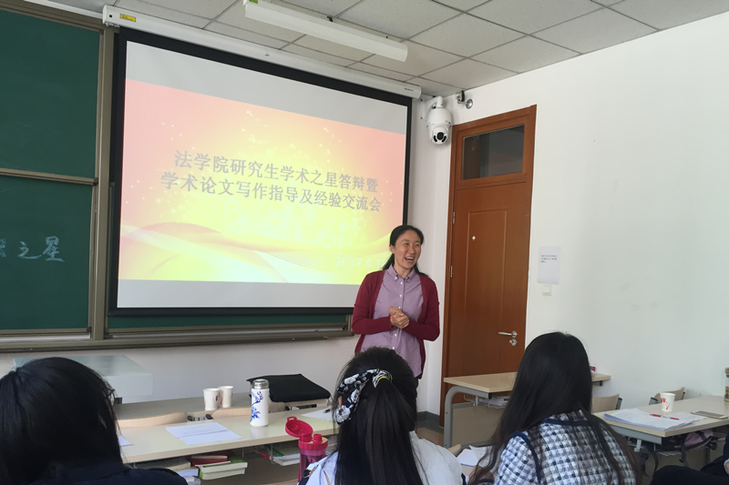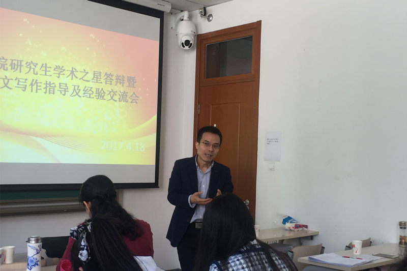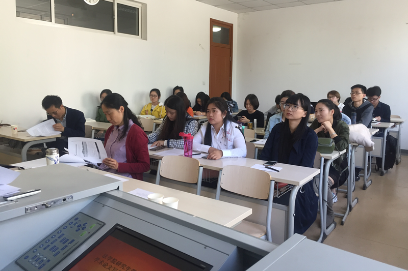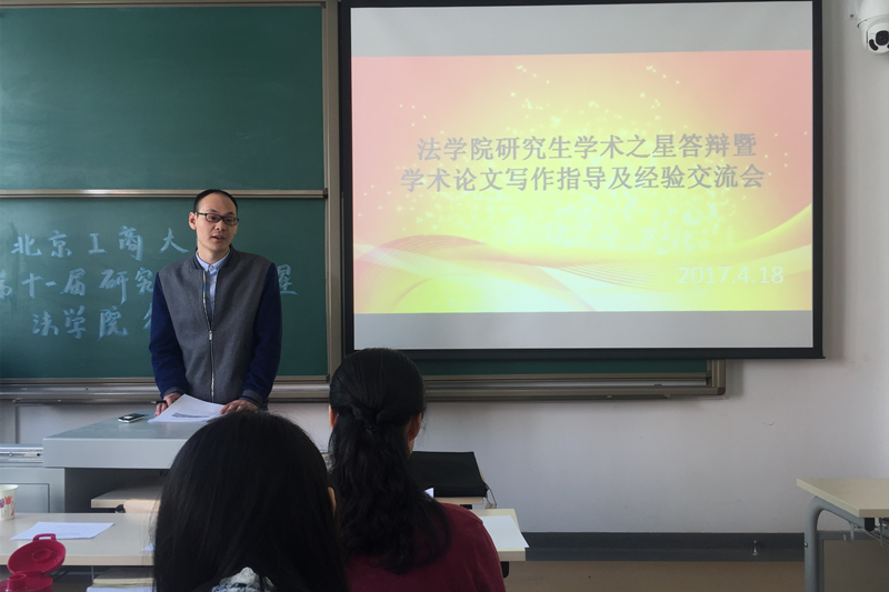 为促进研究生学风建设,提高研究生学术创新的积极性, 4月18日,2017年英国威廉集团官网研究生学术之星答辩暨学术论文写作指导及经验交流会在阜成路校区院办106教室举行。莅临本次答辩会的评委老师有经济法学教研室主任刘道远老师、诉讼法学教研室主任王晴老师,研究生辅导员朱艳新老师出席本次交流会,研一、研二员工参加本次活动。