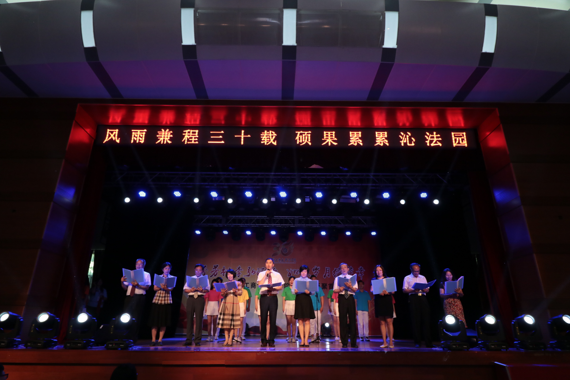 李仁玉、刘淑莲等的十位教师代表与二十名本科生共同表演朗诵 《三十韶华,桃李芬芳》,朗诵回溯了学院流光溢彩的漫漫征程,重温了学院一路走来的铿锵歌唱,感动了在场的每一个人。
