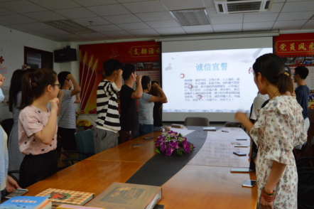 最后一个环节,全体同学起立,共同宣誓:“诚实守信,立身之本;人人诚信,道德日兴;社会诚信,和谐文明。我将遵守国家的法律法规,恪守诚信的道德规范,以至诚之心,待人处世;以至诚之德,律言律行,树立和维护上海的诚信形象,建立和完善我国的诚信体系。立身先于立业,诚信伴随人生。内诚于心,外信于人!内诚于心,外信于人!”诚信的誓言回荡在教室,也回荡在每个人的心中。