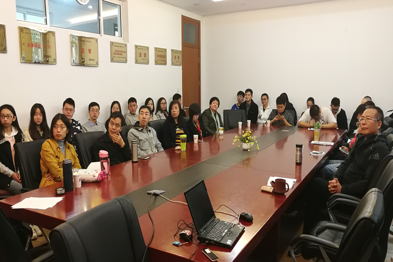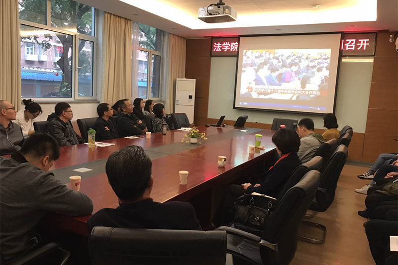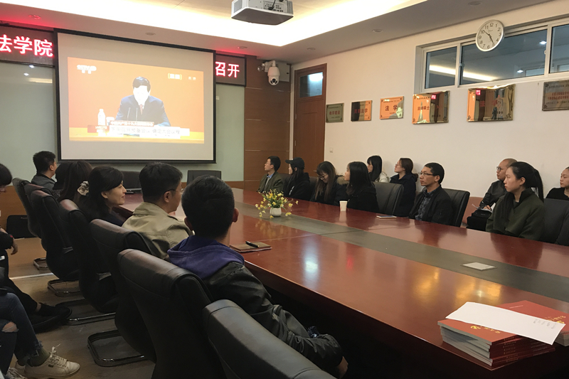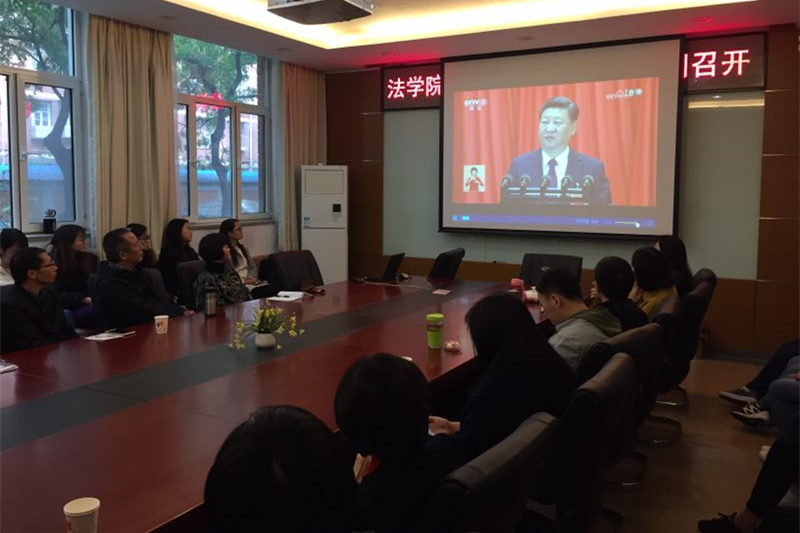 最后,李仁玉教授作为教师代表发表观看感言,他表示十九大的召开是两个一百年的关键时刻,具有深远的意义。同时,总书记提出了新矛盾,每次矛盾的认定都是一次重大的历史判断,此次新矛盾,对于推进“五位一体”以及“四个全面”具有重要意义。除此之外,报告中明确指出要全面推进依法治国,法治建设必将踏上新的征程。