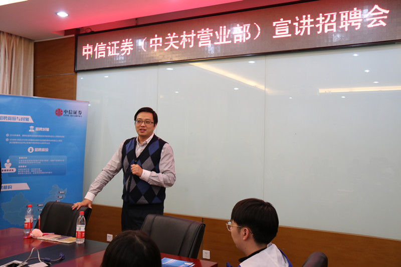 董石磊介绍了宣讲会的主要流程,并由于中信证券就业的公司优秀员工代表陈明就自己的就业经验与同学们分享。