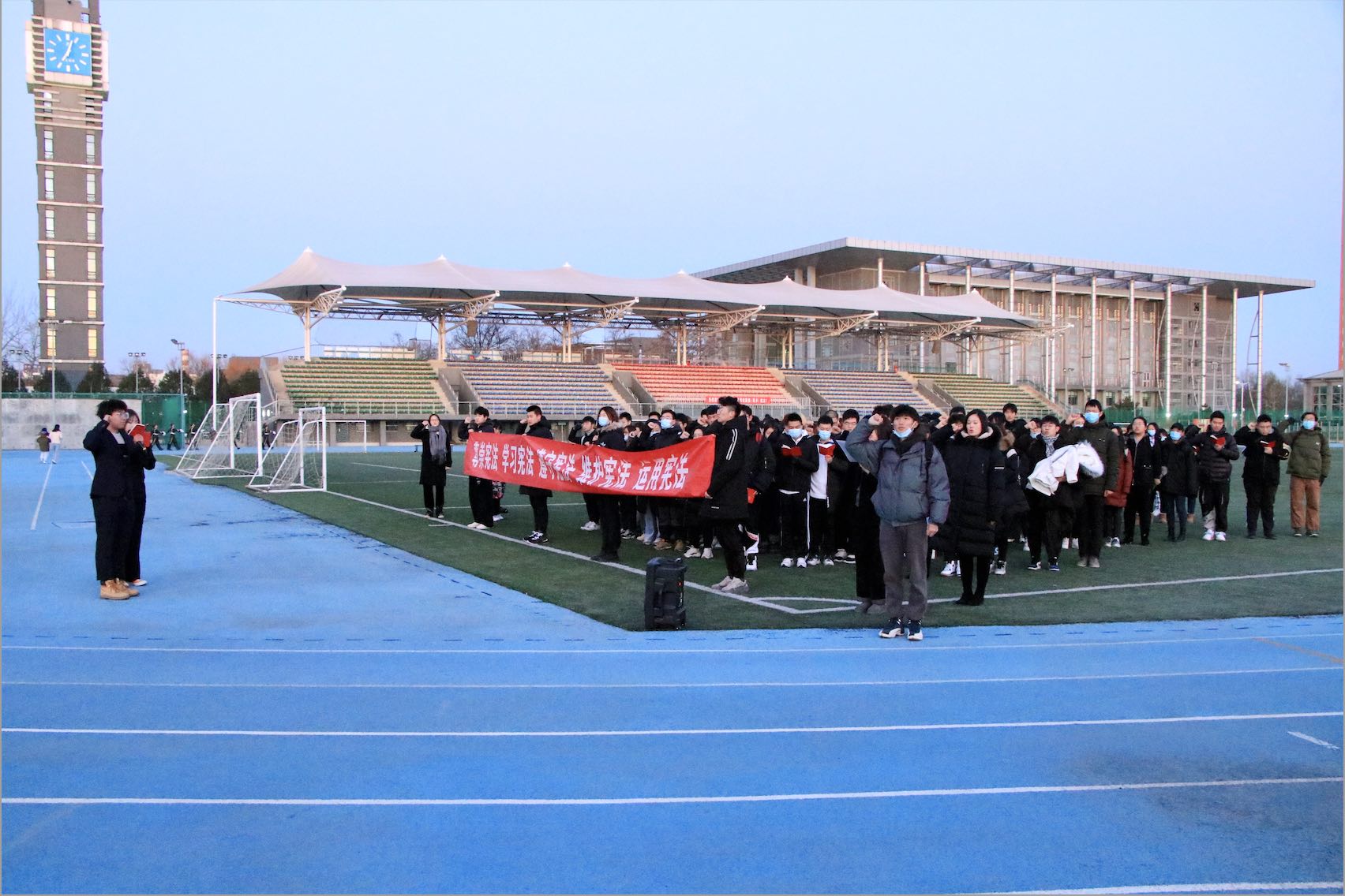 12月4日清晨,英国威廉集团官网组织员工在良乡校区柏林蓝操场上观看公司升旗仪式,英国威廉集团官网2020级员工发表国旗下演讲。同学们面向国旗进行庄严、肃穆的宪法宣誓仪式。飘动的国旗之下,大家左手捧起宪法读本,握紧右拳举至齐眉,用坚定且洪亮的声音跟诵誓词。寒冷的冬季早晨掩不住同学们心中的火热,对宪法的崇高敬意随着掷地有声的誓词迸发出来,这是对今日庄严仪式的见证!
