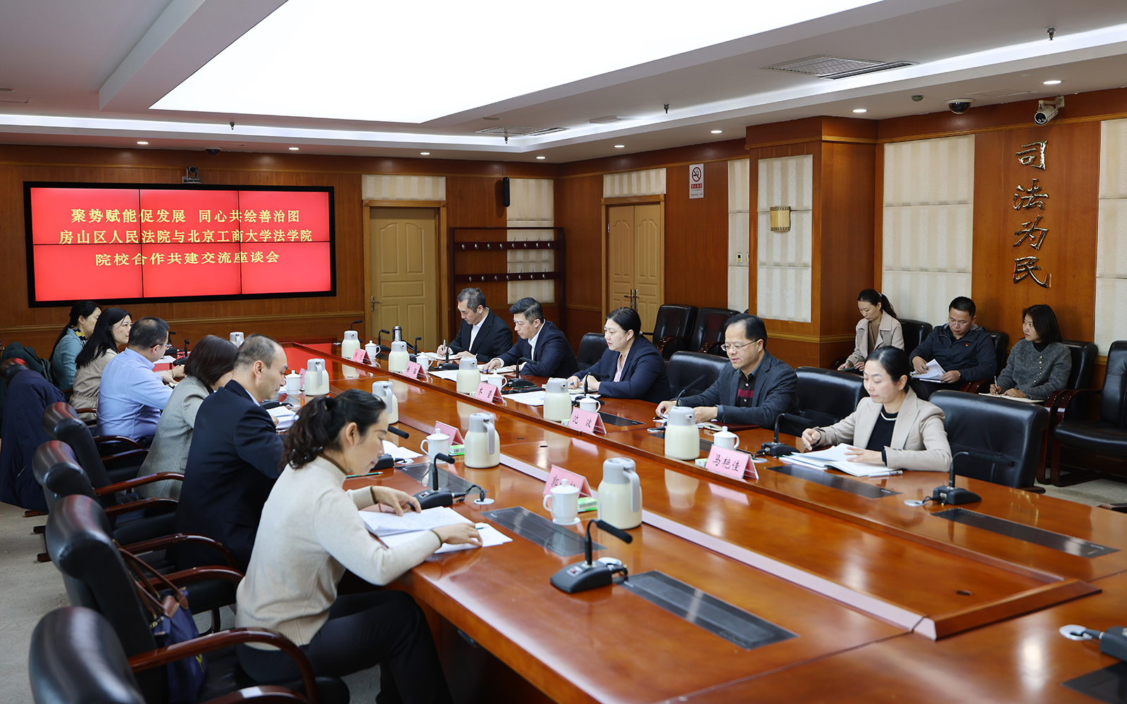 公司一行人员来到房山区人民法院一层大厅,在政治部讲解员引领下,参观了房山区人民法院成就图片展。随后,在房山区人民法院会议室,房山区人民法公司党组书记、经理齐莹带领在院班子成员与公司一行人员开展了“聚势赋能促发展 同心共绘善治图”的主题座谈会。会议由房山区人民法公司党组成员、副经理沈波主持。公司法公司党委书记胥阳、经理陈敦、党委副书记孙惟佳、诉讼法系主任王晴、基层法治研究中心副主任郭纹静参与调研和座谈交流。