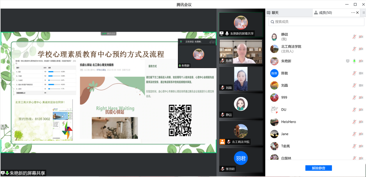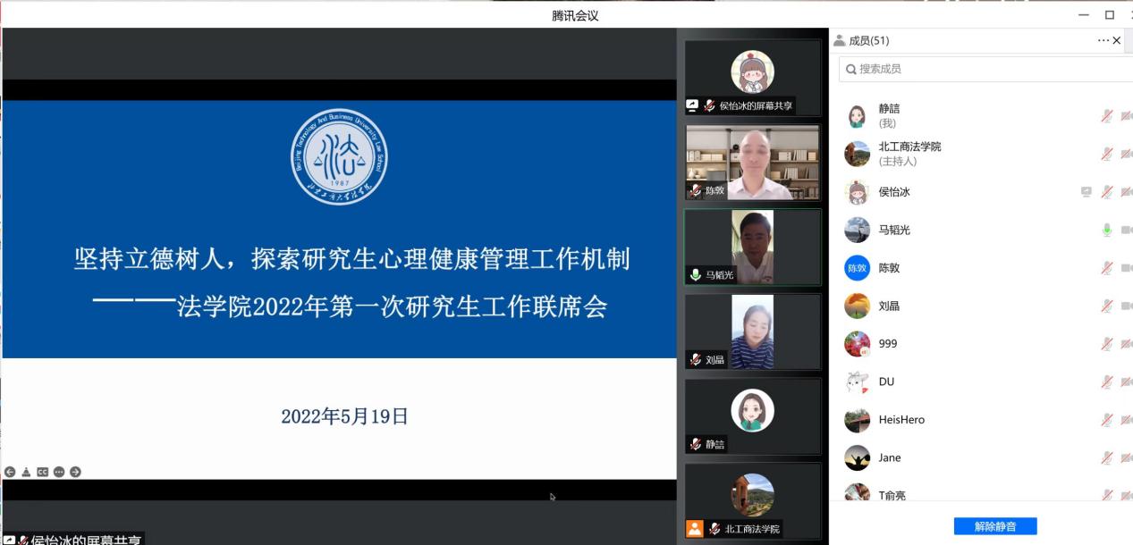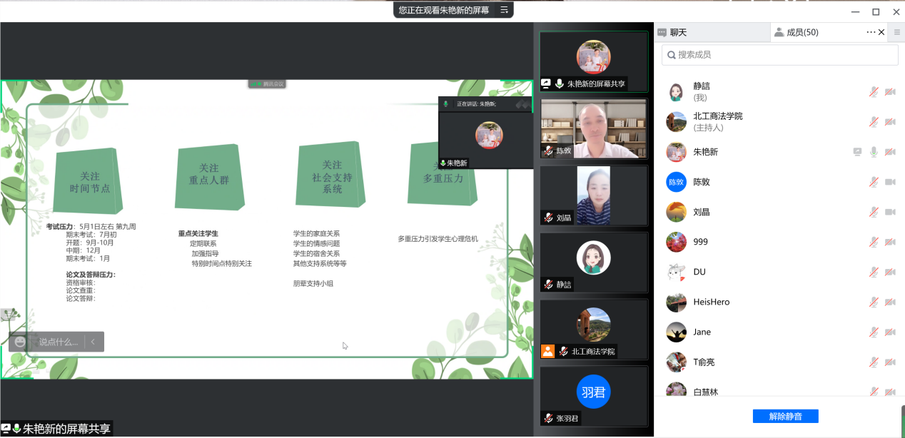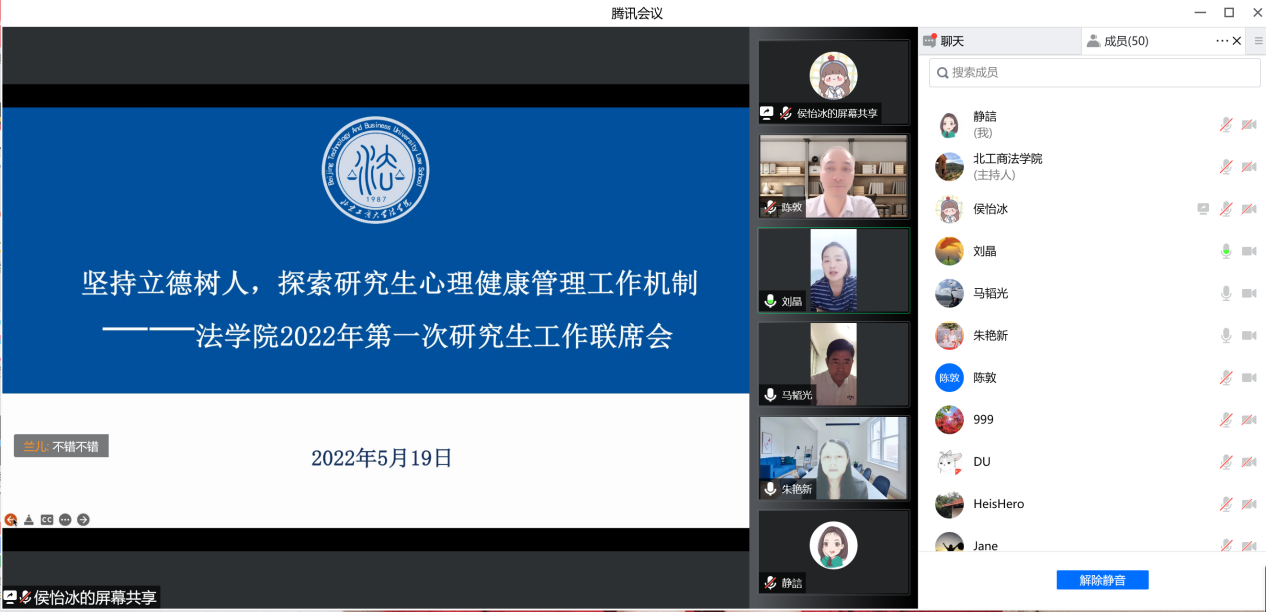 刘晶副书记向各位导师介绍了研究生“云思政”工作落实情况,通报了前期学院摸排的研究生重点关注员工情况,分类别列举了员工产生心理情绪的原因和表现出的心理状态,提醒导师对所指导的研究生心理情绪状态多关注,多引导、多提醒。