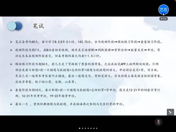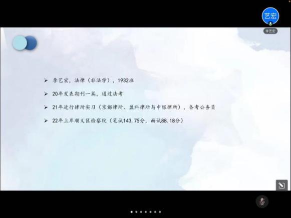 2022届毕业生李艺宏同学现已完成顺义区人民检察院政审环节,她主要从报考、笔试、面试三个方面分享备考经验。她介绍了笔试的前、中、后期各阶段的学习重点,建议学习时按部就班,及时调整个人学习计划,在面试环节注意外在表现,自信端正,同时她针对面试机构选择等热点问题给予建议。李艺宏同学认为,个人职业发展规划要结合自身能力、生活情况等多方面因素考虑,她鼓励学弟学妹早做规划,多手准备,不懈追求。
