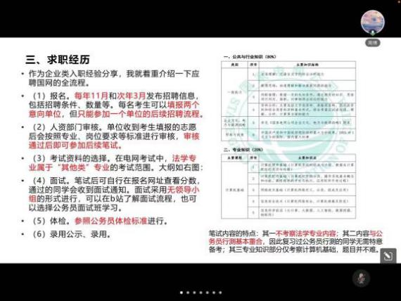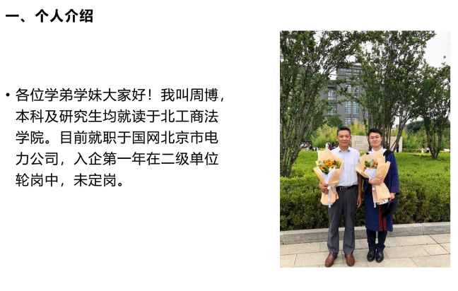 2021届毕业生周博现就职于国家电网北京市电力公司,他从报名、考试资料选择、笔试、面试、体检等方面,介绍了应聘国家电网的全流程,分享了经验。同时他为学弟学妹提出四点建议,一是重视求职,秉持“参与就有机会”的理念;二是重视应届毕业生身份,注意企业招聘限制;三是重视基本能力的培养,不断学习进步;四是以良好的心态面对各种挑战。