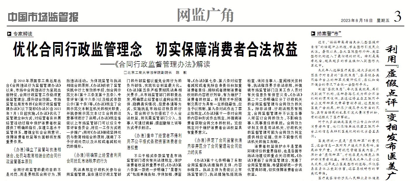 消费者权益保护水平是营商环境评价的重要指标,也是各国市场法治建设的重点关注领域。《办法》更新了合同监管理念,完善了合同监管措施,希望能够进一步优化营商环境,切实保障消费者合法权益。