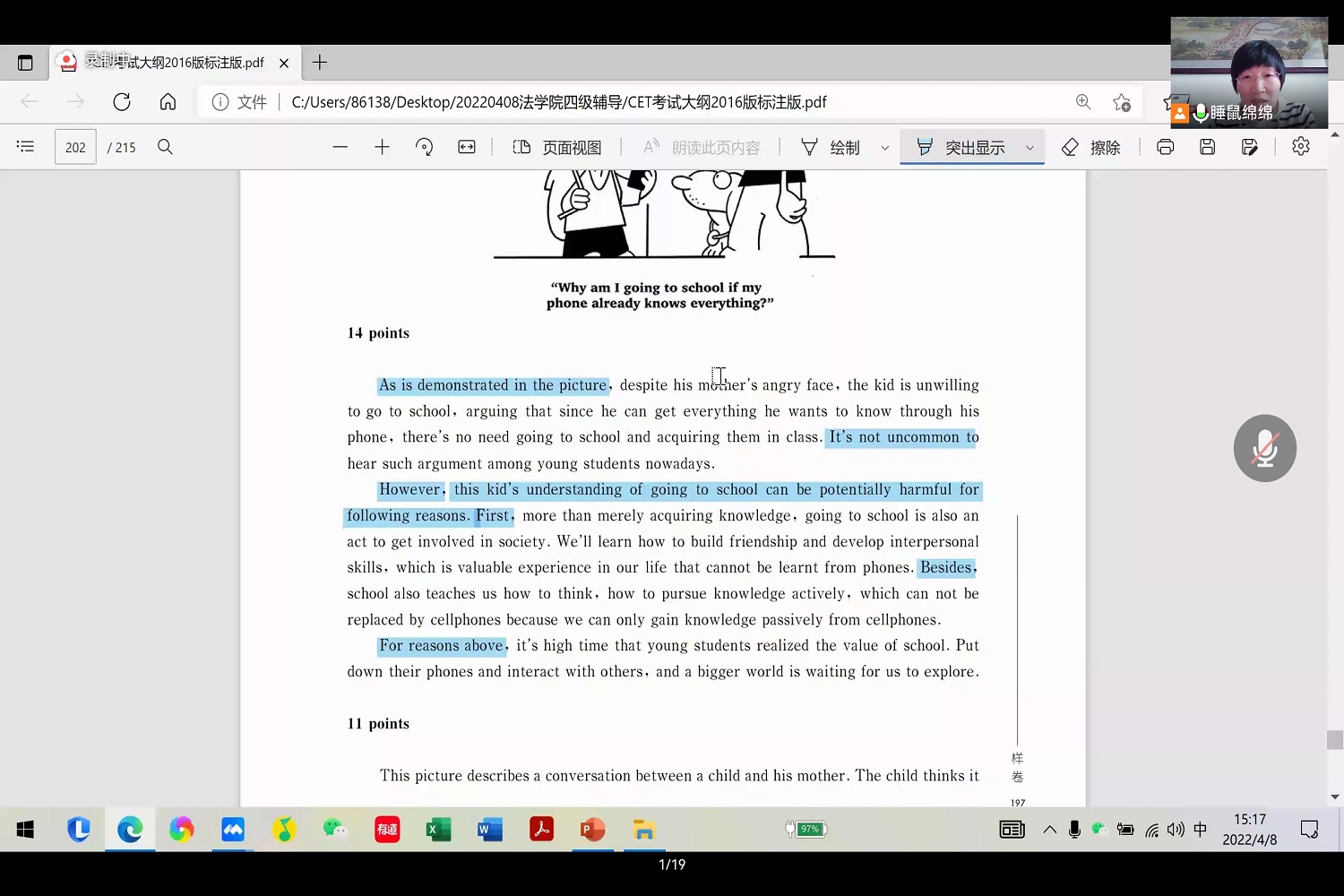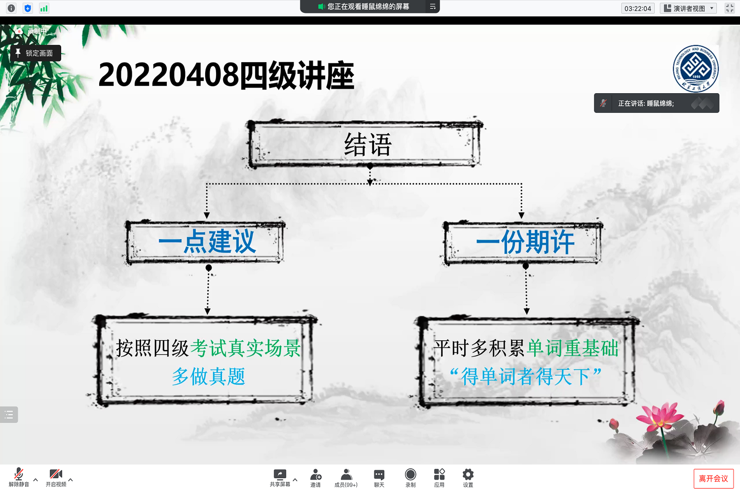 最后,吕绵老师对大家提出几点建议和期许:一是按照四级考试真实场景多做真题,二是注重平时单词积累,“得单词者得天下”。道阻且长,行则将至。语言学习并非一朝一夕,必要经过千锤百炼。