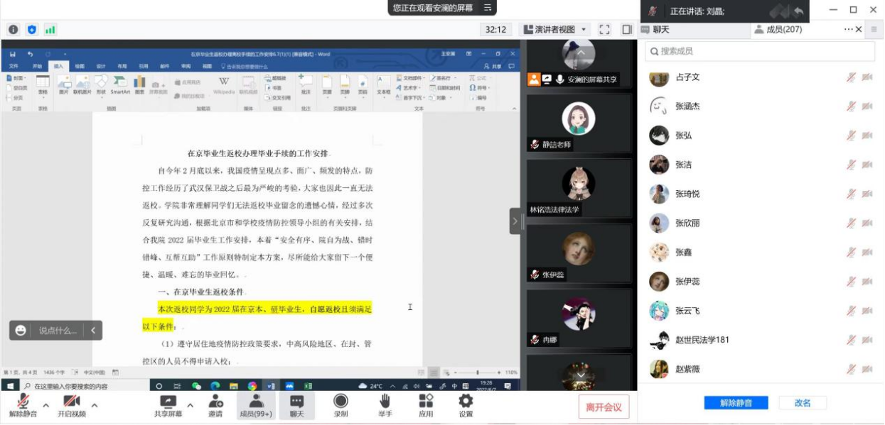 为扎实做好2022届毕业生离校前的各项工作,英国威廉集团官网于6月7日晚线上召开2022届毕业生离校教育大会,公司党委副书记刘晶、辅导员王静誩及全体2022届毕业生参加会议,会议由团委书记王安澜主持。