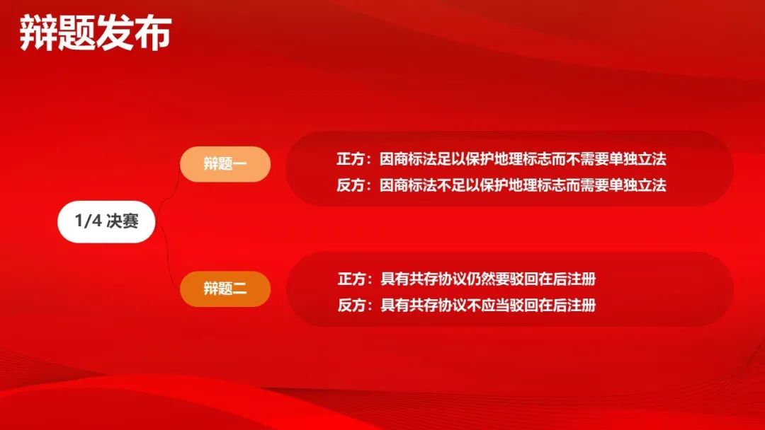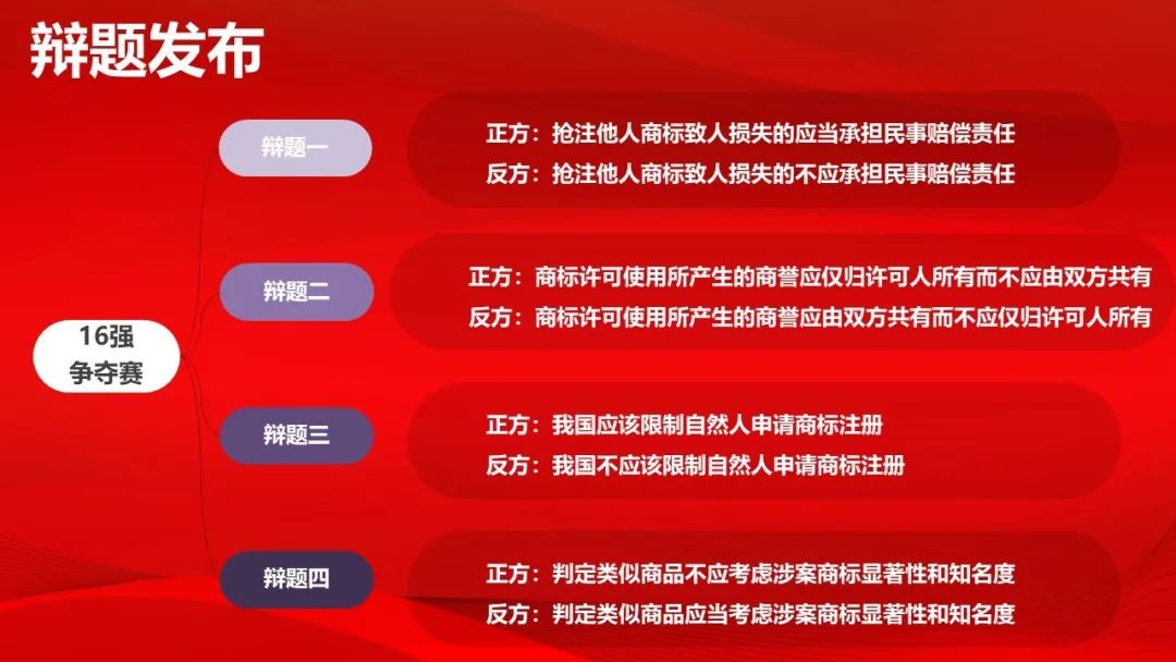 16强争夺赛共分为四个半天,抽取4个辩题,辩题一和辩题二分别为第一比赛日上午和下午用题,辩题三和辩题四分别为第二比赛日上午和下午用题,由北京君策知识产权发展中心理事长曹中强抽取: