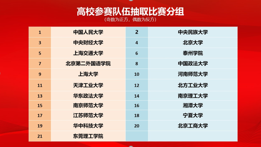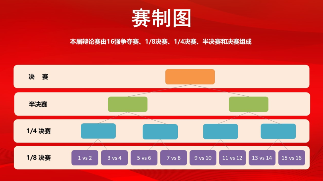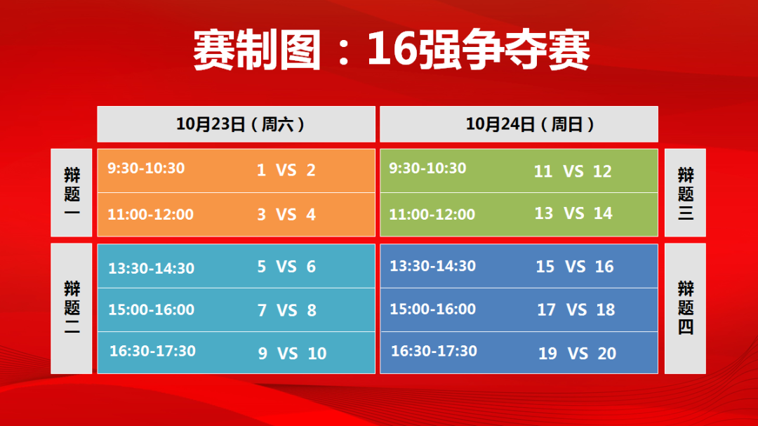 第一,关于比赛分组的抽签。16强争夺赛采取抽签方式,确定辩论的比赛分组和正反双方(奇数为正方,偶数为反方)。