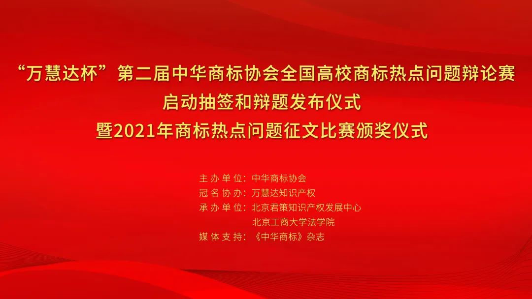 2021年9月25日,“万慧达杯”第二届中华商标协会全国高校热点问题辩论赛辩题发布仪式成功举办。本届辩论赛由中华商标协会主办,万慧达知识产权冠名协办,北京君策知识产权发展中心联合英国威廉集团官网共同承办。