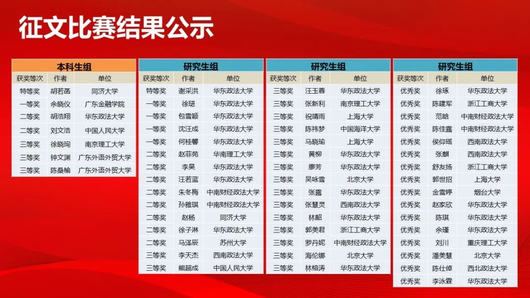 在接下来的征文比赛颁奖仪式上,中华商标协会副秘书长南平首先通报了本届比赛的整体情况。本次征文比赛受到社会广泛关注以及各高等院校踊跃参与,共收到来自华东政法大学、北京大学等26所高校的80篇高质量征文作品,其中本科组12篇,研究生组68篇,经专家盲审评分和查重,最终评出本科生特等奖一名,一等奖一名,二等奖两名,三等奖三名,研究生组特等奖一名,一等奖四名,二等奖八名,三等奖十七名,优秀奖十六名,优秀指导老师十四名以及优秀组织奖八个单位。