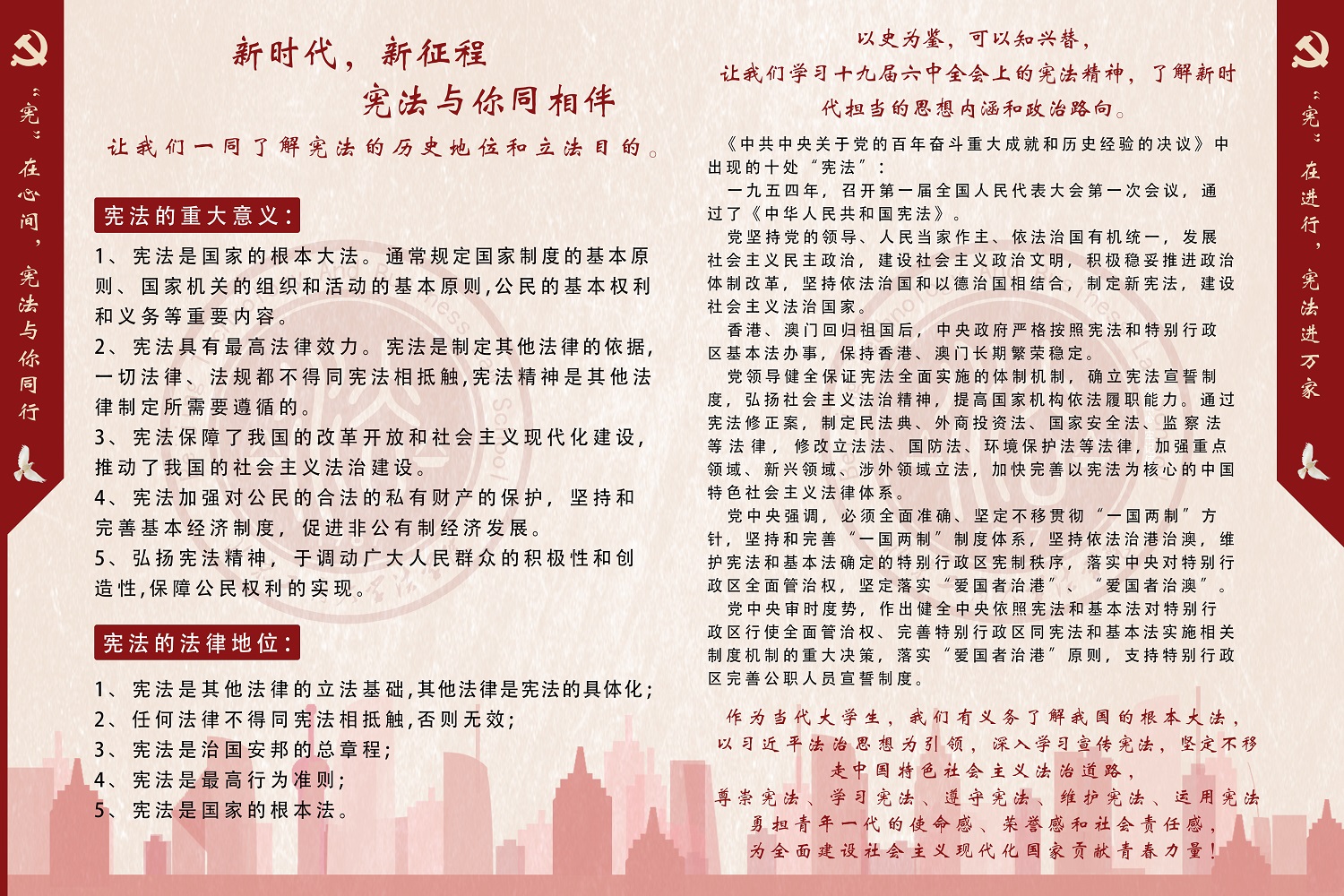 2021年12月4日是第八个国家宪法日,11月29日至12月5日是全国第四个“宪法宣传周”。为深入贯彻党的十九大和十九届六中全会精神,深入学习宣传贯彻习近平法治思想,坚定不移走中国特色社会主义法治道路,引导全体师生厚植爱国主义情怀,英国威廉集团官网由英国威廉集团官网牵头组织了形式多样、内容丰富的宪法宣传活动,营造浓厚校园法治文化氛围。