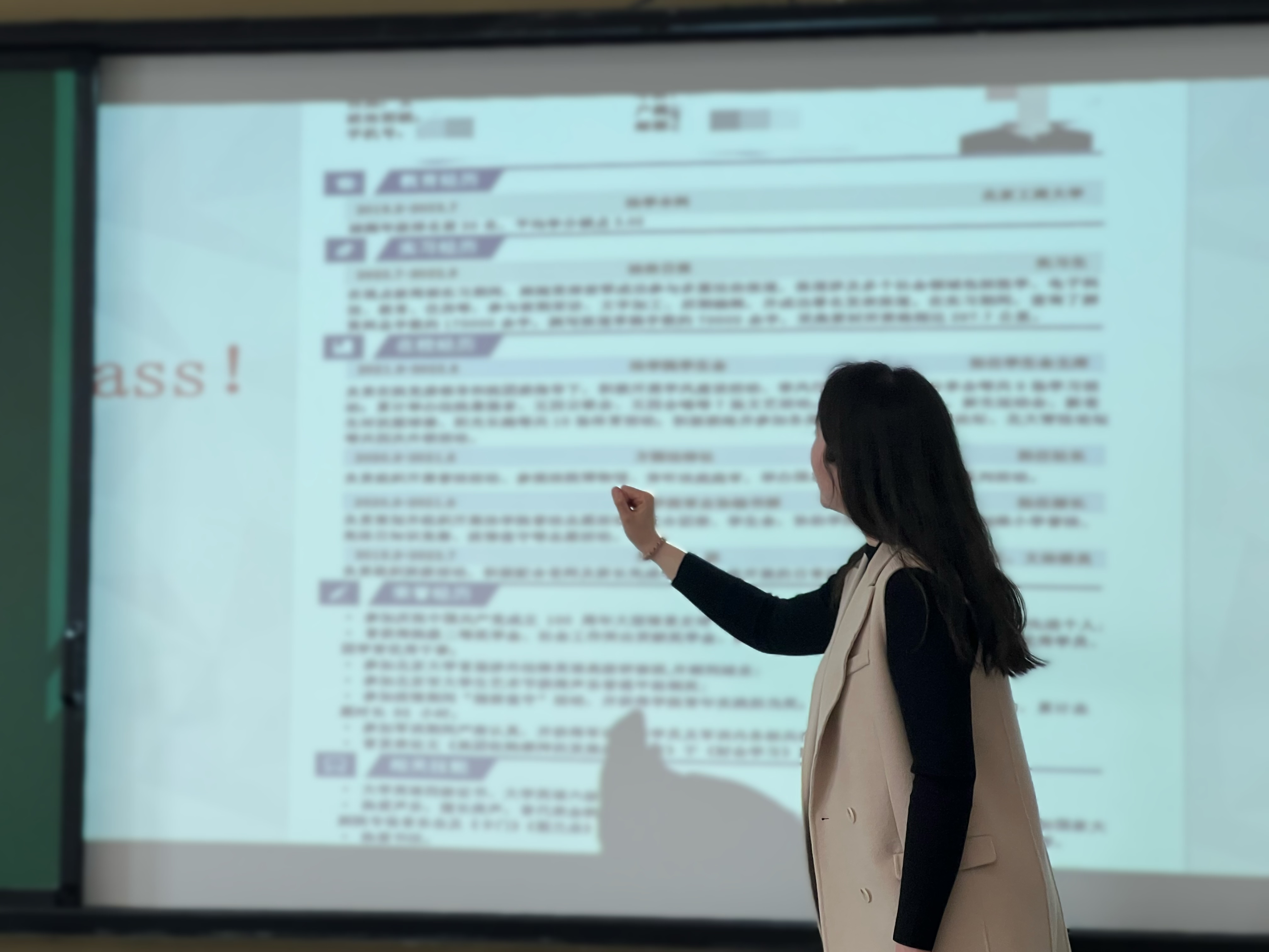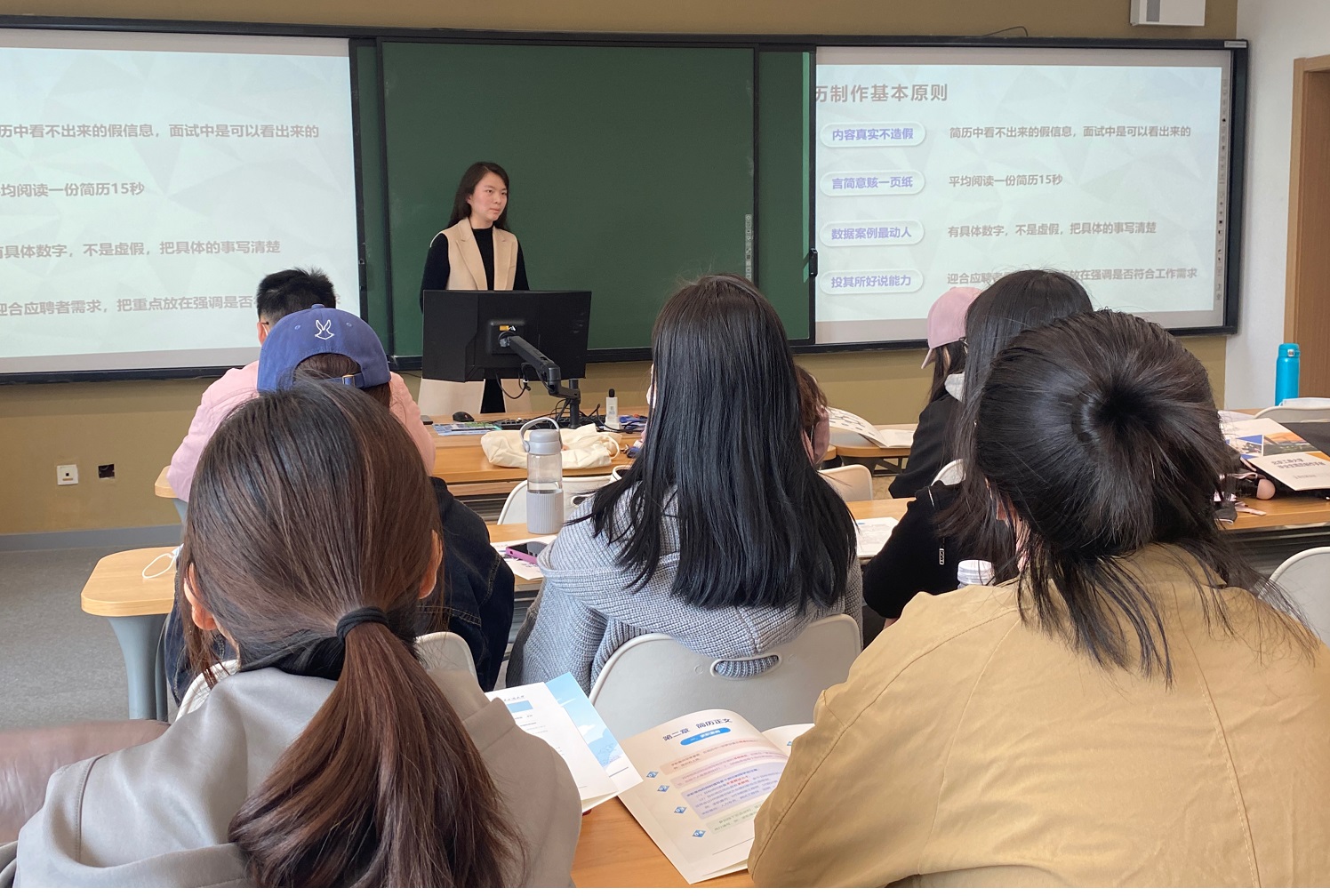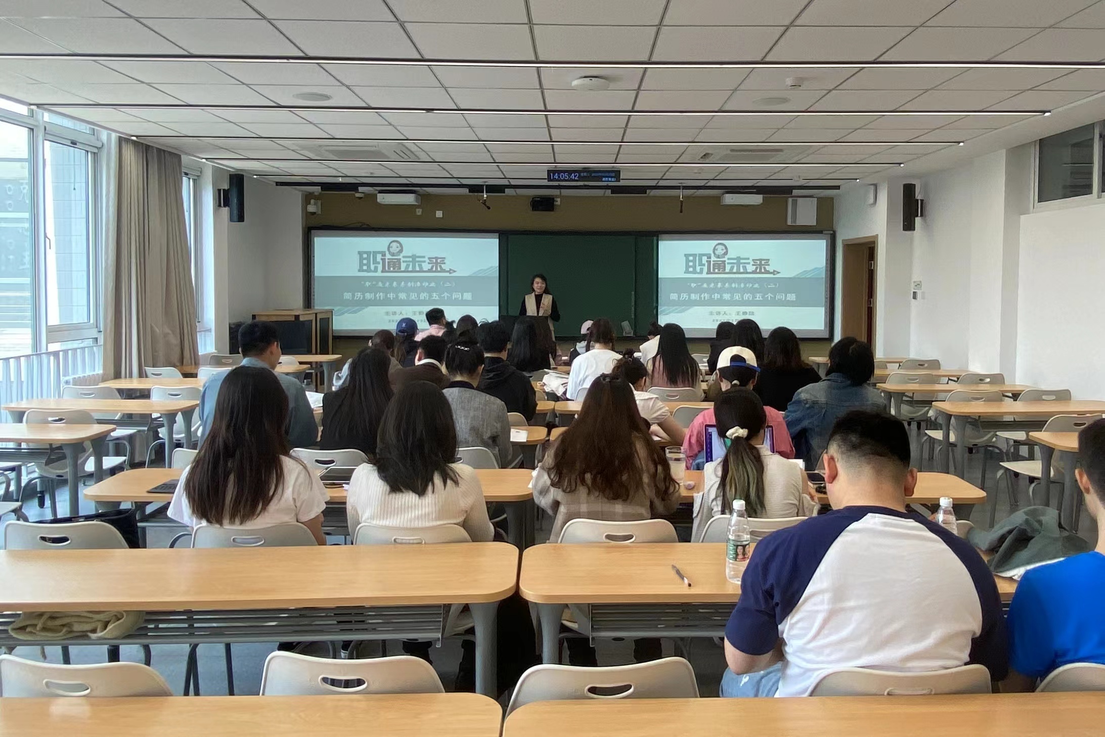 在简历诊所环节,王老师以毕业生的简历为例,通过对比修改前后的版本,让同学们直观感受一份合格的简历应该满足哪些要素。王老师提醒同学们要尽早完善简历,她强调这是获得实习和就业机会的敲门砖。